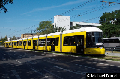 In den zurückliegenden Tagen bekam die Straßenbahn eine weihnachtliche Beklebung mit dunkelblauer Grundfarbe und goldenen Motiven. „Unsere Mitarbeitenden in der Grafikabteilung haben sich gemeinsam mit der Dresden Marketing GmbH (DMG) Gedanken gemacht und eine Gestaltung gefunden, die nicht aufdringlich ist und sogar internationales Flair versprüht“, beschreibt DVB-Marketingleiter Martin Gawalek die Entstehung der „Weihnachtsstraßenbahn“. Die Besonderheit gegenüber allen anderen Wagen sind leuchtende LED-Streifen entlang der Dachkante. Das fällt in der dunklen Jahreszeit besonders auf. Insgesamt wurden 80 Meter LED-Streifen außen am Fahrzeug verbaut. „Eine zusätzliche Beleuchtung so einzubauen und anzuschließen, dass sie den Vorgaben von Betriebsleiter und Behörden entspricht, stellte sich als besonders knifflig heraus. Hier gebührt den Technikern der Straßenbahnwerkstatt ein besonderes Lob für ihre Kreativität“, beschreibt Gawalek die Umsetzung.