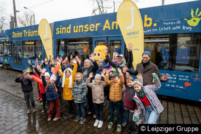Anlässlich des Welttags der Kinderrechte haben die Leipziger Verkehrsbetriebe in Kooperation mit dem Leipziger Kinder- und Jugendbüro des Deutschen Kinderschutzbundes eine Kinderstraßenbahn eingeweiht. Diese verkehrt in den nächsten Jahren im gesamten Stadtgebiet. Getreu dem Motto "Jedes Kind hat ein Recht auf Zukunft" sind auf dieser Straßenbahn Handabdrücke und Zukunftswünsche von Kindern aus Leipzig verewigt. "Mit der Gestaltung einer Aktionsstraßenbahn setzen wir ein buntes Zeichen für Kinderrechte und geben den Zukunftswünschen von Leipziger Kindern eine Bühne im öffentlichen Raum. Wir freuen uns ganz besonders, das Leipziger Kinder- und Jugendbüro als Partner für diese Initiative gewonnen zu haben. Uns verbindet nicht nur die enge Beziehung zu Leipzig, sondern auch der Wunsch, Kindern eine lebens- und liebenswerte Zukunft zu ermöglichen", sagt LVB-Marketingchefin Sandy Brachmann.
