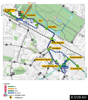 Linie 13:Fährt im Westen von Kaditz planmäßig über Liststraße, Bischofsweg und Görlitzer Straße bis zum Gleiswechsel am Rosa-Luxemburg-Platz. Dort wird gewendet.